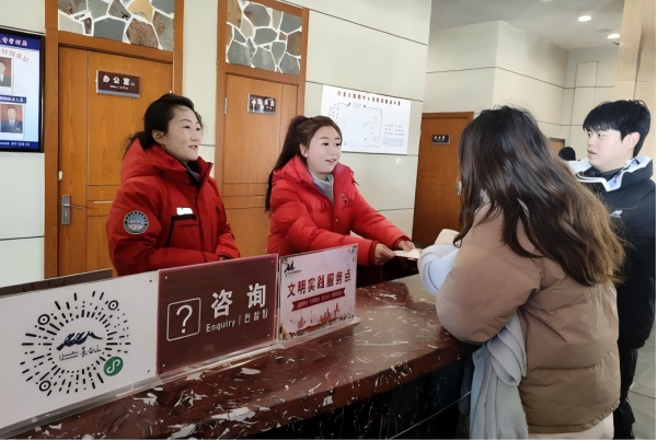 “请问有剪刀吗?我想把这个吊牌剪掉。”“天气太冷了,有热水吗?”“这个暖贴是免费的吗?”“在手机上怎么买票?”……股份公司坚持“游客在哪里,文明实践就延伸到哪里”的工作思路,依托文明实践服务点,为游客免费提供热水、轮椅、暖贴、口罩等,以及天气和票务咨询、乘车指引、失物招领、安抚解答,并为老弱病残孕提供帮助。